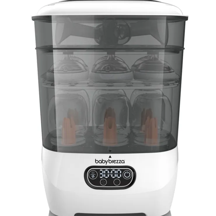 The Baby Brezza® One-Step™ Sterilizer Dryer Advanced. The most advanced way to sterilize and dry all brands of bottles, pump parts and accessories. Using natural steam, the One-Step™ Sterilizer Dryer Advanced kills 99.9% of the germs in your baby’s bottles and automatically dries 33% faster (versus Baby Brezza One Step Sterilizer Dryer). The sterilizer includes a HEPA-filter, so the dryer uses clean air that’s 99.9% free of germs. Bottles will remain sterile for up to 24 hours, when left in the unopened sterilizer. An easy-to-use LCD control panel allows you to select from 4 different functions: Sterilizer and Dryer, Sterilizer Only, Dryer Only or Storage. The modular mix & match configuration, use it 4 different ways to meet your needs, features two baskets and a unique tray, which will hold up to 8 bottles and 2 full pump part sets, plus accessories.