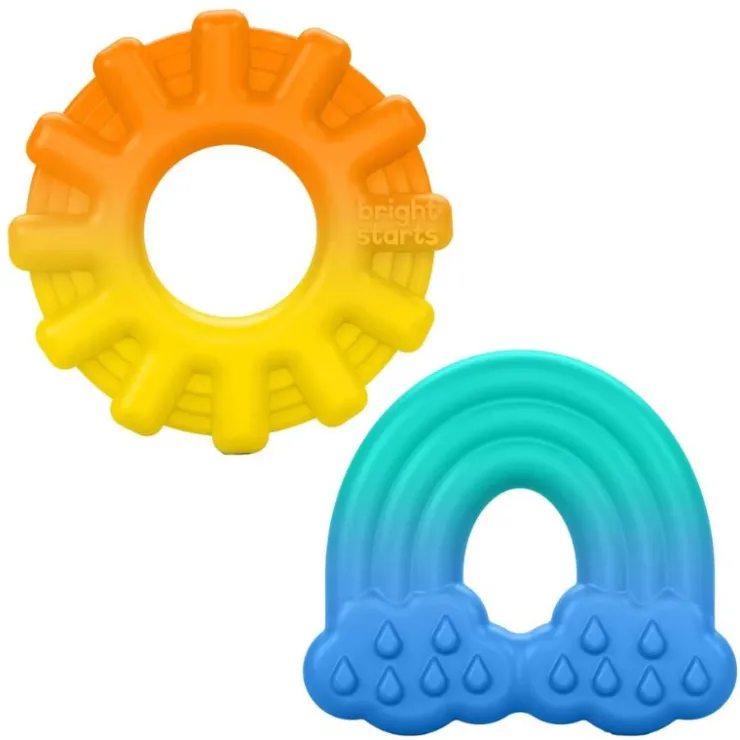 Sunny days are here with the Chance of Smiles Silicone Teether from Bright Starts! Babies are drawn to the bright gradient colors and playful shapes of these weather-inspired toys, while parents will love the BPA free, non-toxic silicone material. Silicone is ultra-soft to the touch and extremely durable, creating a safe and enjoyable toy for teething tots. Perfect for pain relief, this unisex 2-pack sun and rainbow features multi-textured surfaces to comfort and soothe baby’s sore gums. Keep one handy in the diaper bag and one at home or keep them together for fun options for baby. With an easy-to-grasp design, baby can self-soothe when they need teething comfort. These sunshine and rain teethers encourage the development of fine motor and sensory skills as baby grasps and teethes the colorful forecast!Â