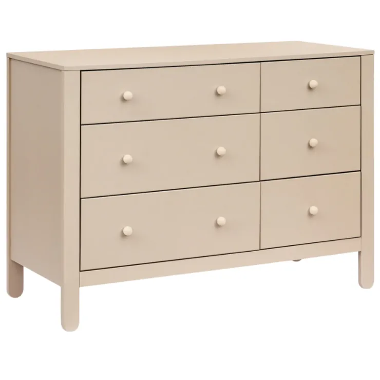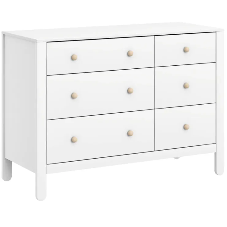 Combine playful charm and practicality with the Marisol 6-Drawer Dresser. With three large drawers for blankets and clothing and three smaller ones for everyday essentials, it features smooth ball-bearing glides for easy, quiet use. Its two-toned finish and whimsical popsicle-shaped feet add a modern yet fun touch, making it a stylish and functional piece that grows with your little one.