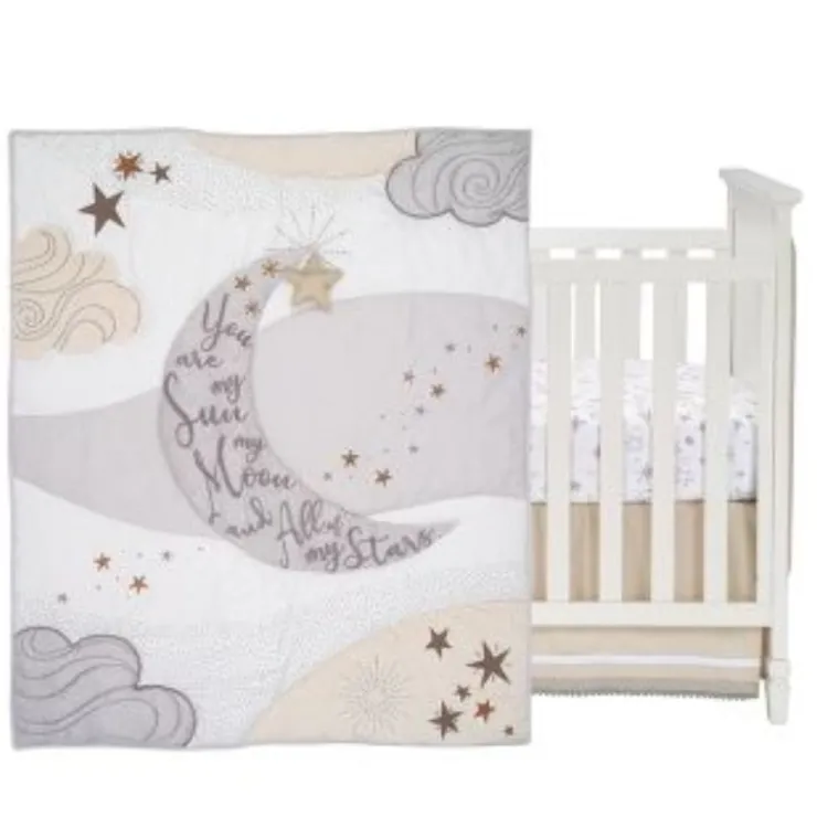 - Three-piece baby bedding set includes one quilt, one breathable 100% cotton fitted crib sheet and one crib skirt