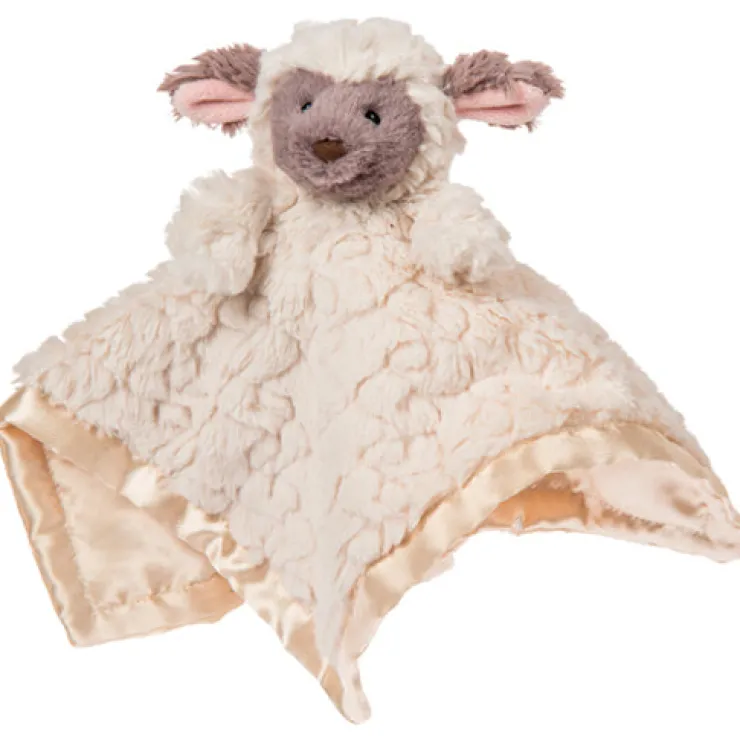- Plush stuffed character sits atop the center of the blanket