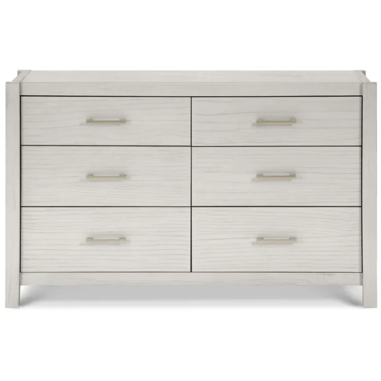Complete your modern farmhouse nursery with the Hemsted 6-Drawer Dresser by Namesake, featuring a premium texturized wood finish and elegant gold hardware that enhances the dresser’s contemporary flair. Soft-closing, ball-bearing drawer glides make this dresser easy to use.