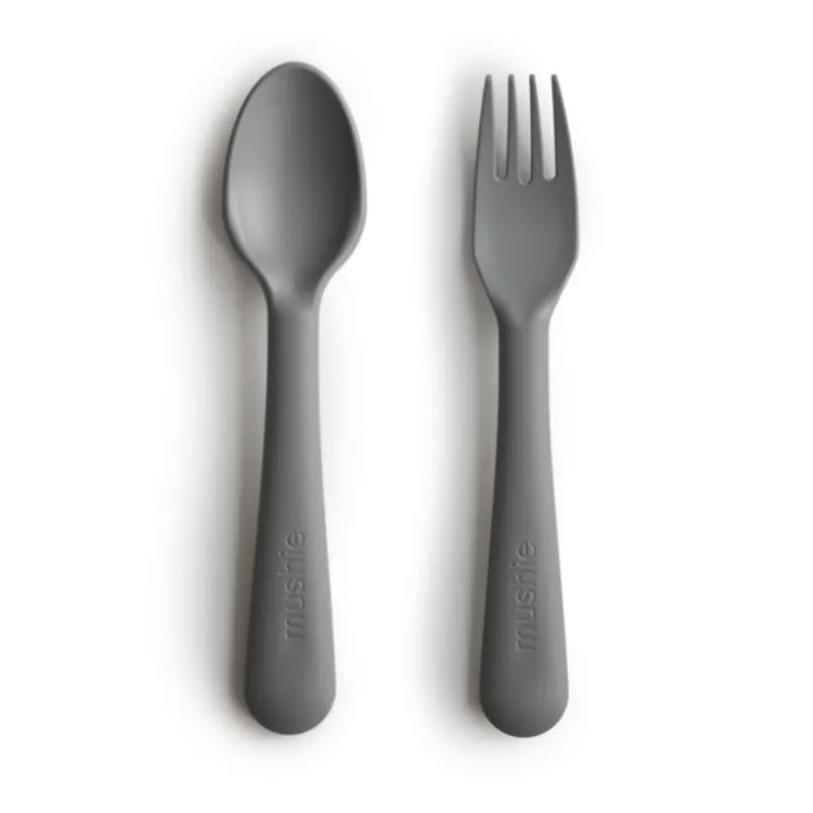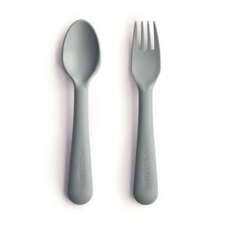 With soft colors and clean design, this flatware fork and spoon set by Mushie is simple and elegant and easy for your toddler and child to hold.