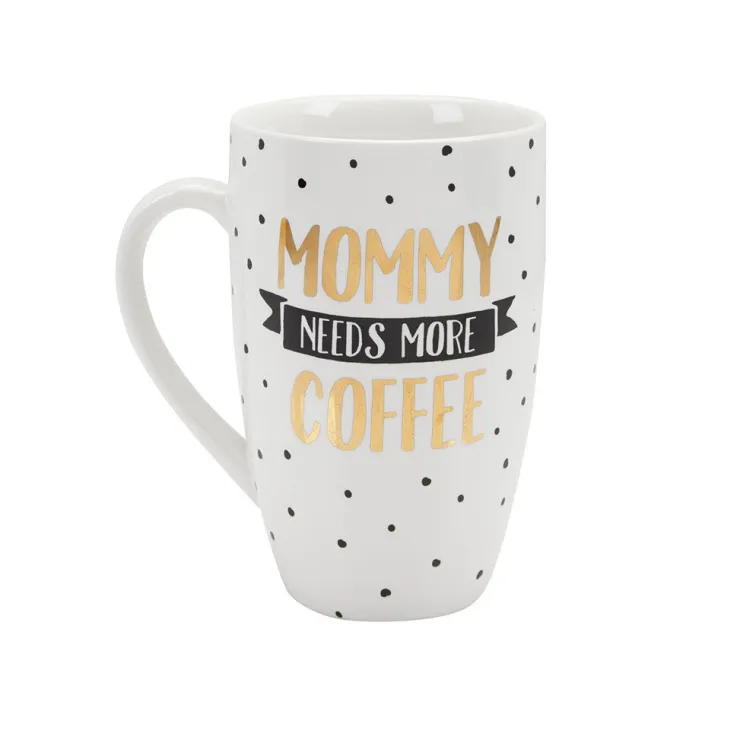 Pearhead’s Mommy needs more coffee mug is the perfect gift for Mom! This white, ceramic mug includes gold and black designs adding a modern touch. “Mommy needs more coffee” is printed in gold foil on the front of mug and black handdrawn dots are printed around the mug. This mug has a large handle to easily hold and carry all of Mommy’s coffee. Fits 2.75 cups or 22 fluid ounces. Recommended hand wash and hand dry. Do not put this mug in the microwave as it’s not microwave safe. This fun mug shows Mom she can do it all with just a little more coffee. Product dimensions: 5.25” W x 5.75” H x 3.75” D
