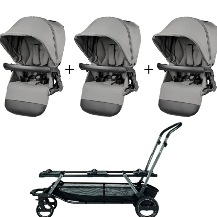 Three will travel in comfort with the Peg Perego Triplette Piroet Stroller and Pop Up Seat Bundle. This spacious chassis features polyurethane wheels with tread, 360-degree agility for effortless maneuvering, and an easy-to-use single handle. The centrally controlled rear braking system simplifies stopping and parking, while the extra-large basket accommodates essentials for three children and two parents.