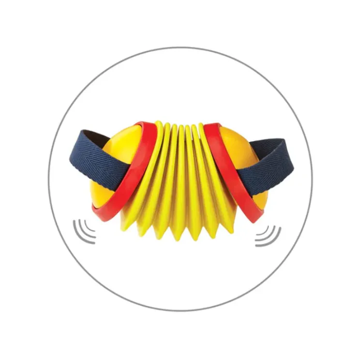 As the concertina by Plan Toys is squeezed in and out, different notes and pitches play.