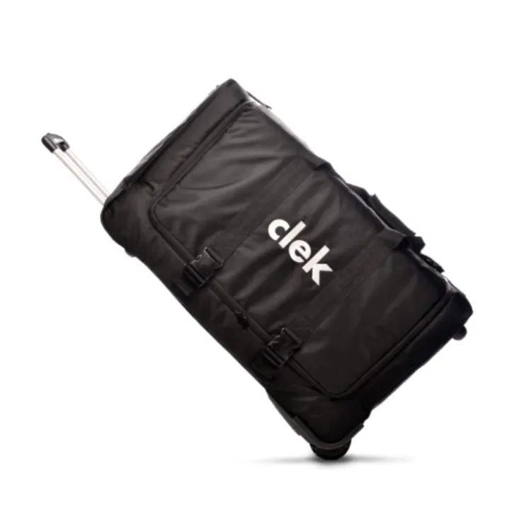 rWith two rugged wheels, a telescoping handle, luggage ID tag, thick layers of padding for optimal protection, plus a little extra room to stow vacation-extras. When not in use, Clek’s universal car seat travel bag folds flat to fit into any trunk or closet.r