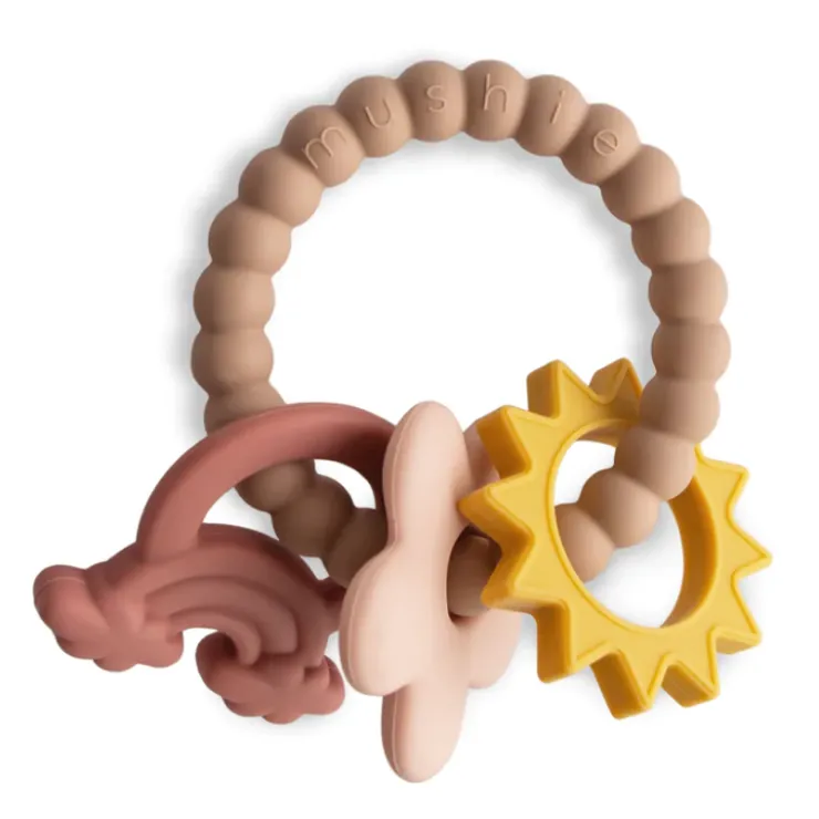 Help little ones explore sensory rich shapes and textures with this silicone teething ring from Mushie.