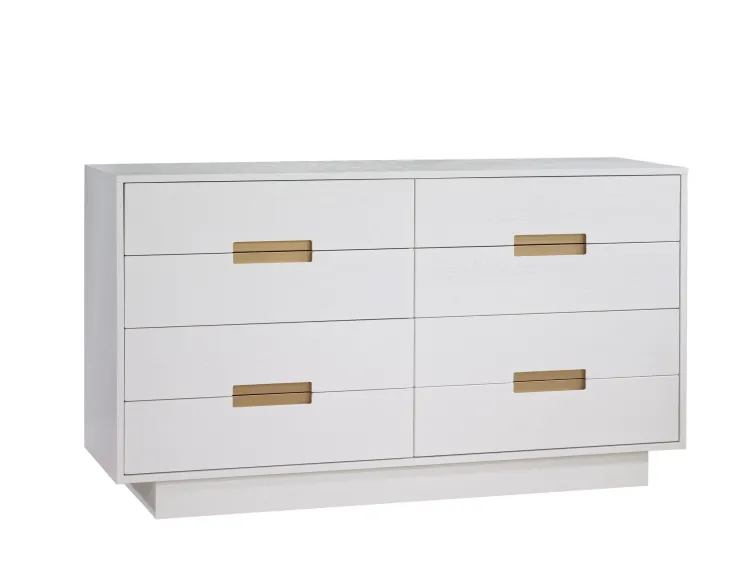 The Como 8-Drawer Double Dresser is a stylish and safe storage solution made in Canada from all-ash wood. Built to last with a lifetime warranty on European reinforced drawer glides and English dovetail construction, it also boasts scratch-resistant microstructured finishes and recessed handles for a touch of luxury. A reinforced back panel and dust cover enhance durability and cleanliness, making it a perfect blend of functionality and elegance.