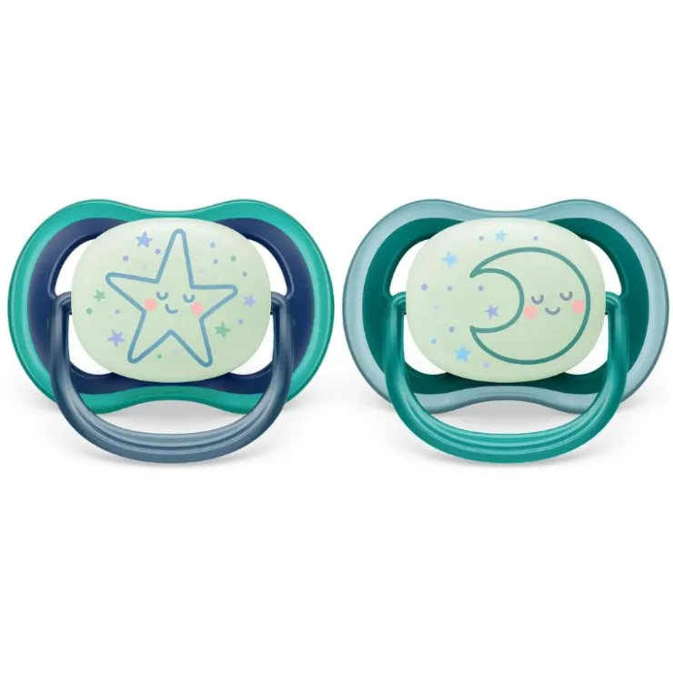 Soothe with the comfort of air. The Philips Avent ultra air has extra-large holes to keep skin dry. It has a glow-in-the-dark button so you can see it when the lights are out. Available in various colors and designs.